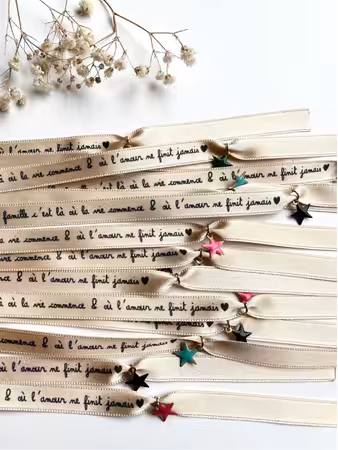Ce bracelet peut être confectionné sur place à partir d’une bobine de ruban uni ou imaginé en amont avec un message spécial via un ruban bracelet personnalisé pour l’occasion.