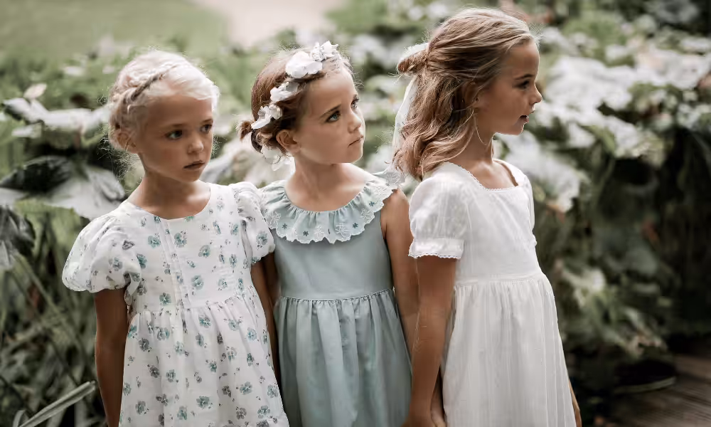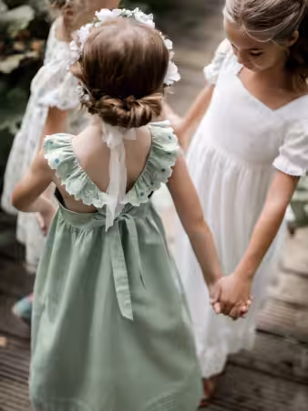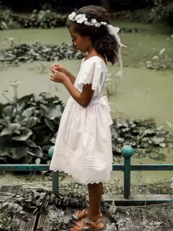 Les petites filles seront magnifiques dans des robes en lin avec des détails de dentelle, de broderie, de plumeti et des accessoires floraux pour une touche de romantisme.