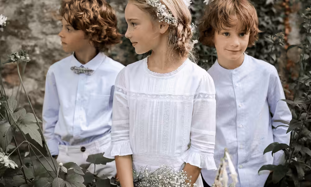 Pour les garçons, des chemises en coton aux fines rayures assortis à des pantalons chino ou bermuda à bretelles compléteront parfaitement l’ensemble. Cette collection apporte une touche de légèreté et de liberté à toute cérémonie, célébrant la beauté et l’innocence de l’enfance.